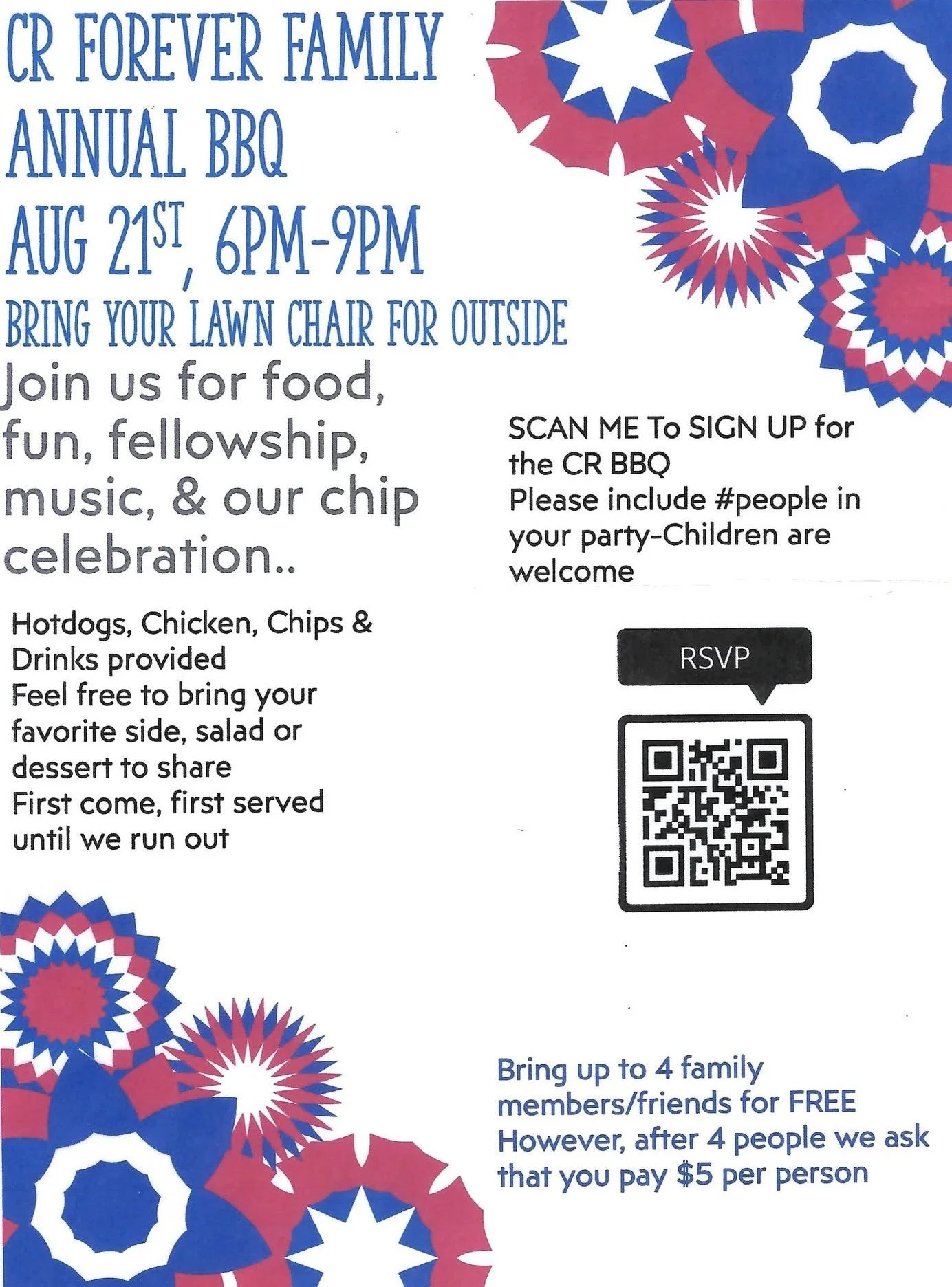 Join us for food, fun, fellowship, music, and our chip celebration. Food provided includes hotdogs, chicken, chips, and drinks, and you’re welcome to bring a side, salad, or dessert to share. Please bring your lawn chair for the outdoor setting. You may bring up to four family members or friends for free; after that, the cost is $5 per additional person. First come, first served until we run out.