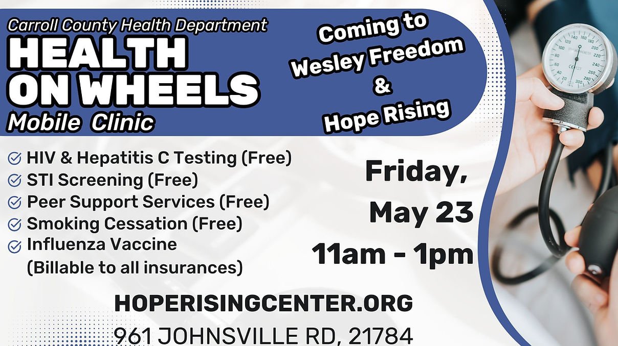 Health on Wheels Friday, May 23, 2025 11:00 AM 1:00 PM Hope Rising Resource Center 961 Johnsville Road Sykesville, MD, 21784 United States (map) Google Calendar ICS Carroll County's Health on Wheels Mobile Clinic will be at 961 Johnsville Road, Sykesville on Friday, May 23rd. No need to sign-up, just stop by between 11 and 1 to be seen.