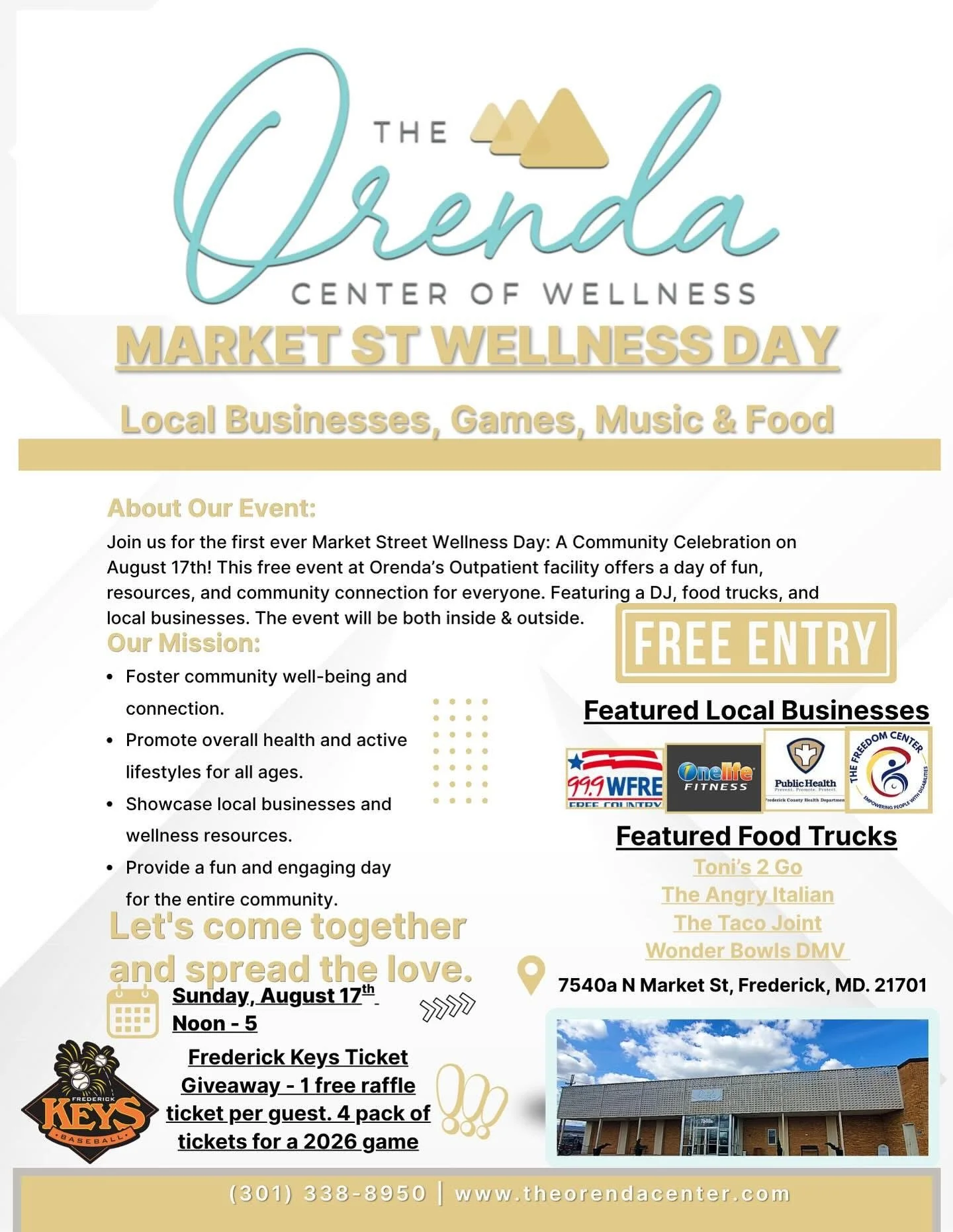 Join us for the first ever Market Street Wellness Day: A Community Celebration on August 17th! This free event at Orenda's Outpatient facility offers a day of fun, resources, and community connection for everyone. Featuring a DJ, food trucks, and local businesses. The event will be both inside & outside. For more information and to register please click on the link below.