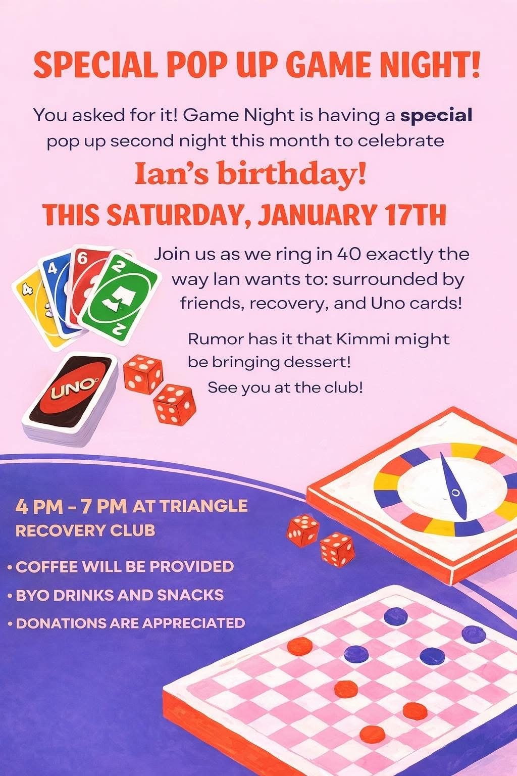 POP UP Game Night at TRC 🃏‼️ Saturday, January 17, 2026 4:00 PM 7:00 PM Triangle Recovery Club 2 North Court Street Westminster, MD, 21157 United States (map) Google Calendar ICS