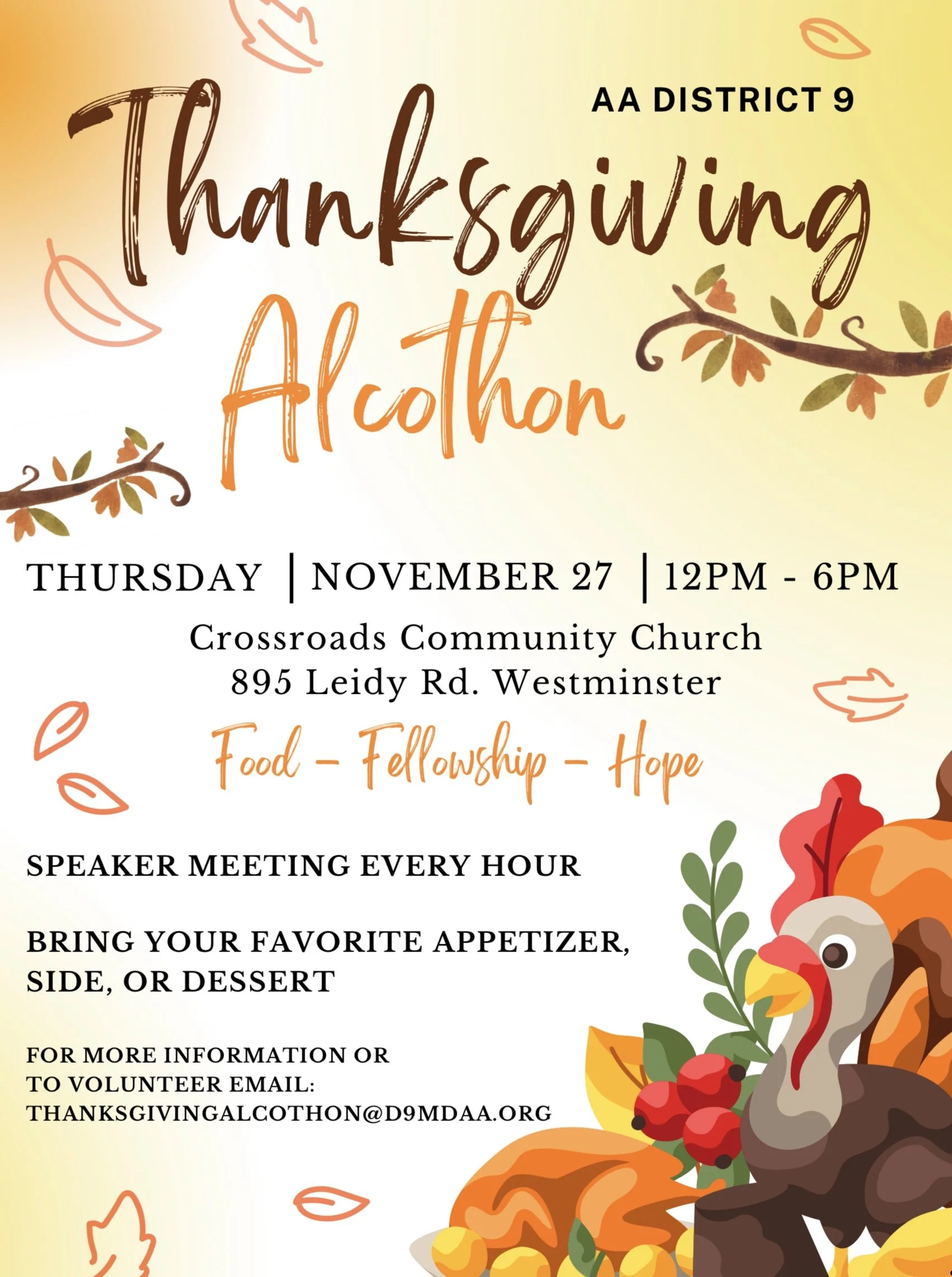 Looking for some extra support this Thanksgiving? Join in for this year’s Alcothon! There will be a speaker every hour, bring your favorite appetizer, side, or dessert to share. For more information or to volunteer please reach out via the link below!